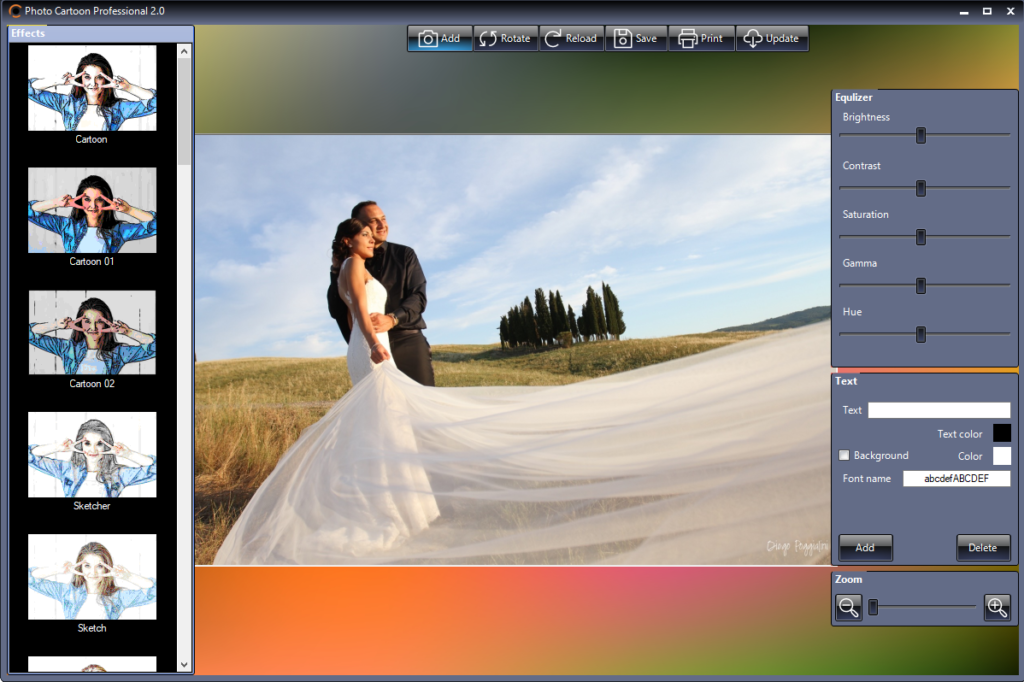 Sulla sinistra del programma ci sono tutti gli effetti e le conversioni fattibili col programma. Oltre alla conversione in version “cartoon”, con questo programma potrai anche trasformare foto in dipinti, foto in disegni a mano, foto in bianco e nero, ecc….