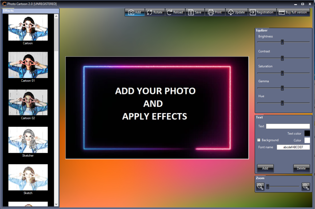 Sulla destra del software c’è invece una barra con l’equalizzazione e la possibilità di aggiungere testo sulle immagini.