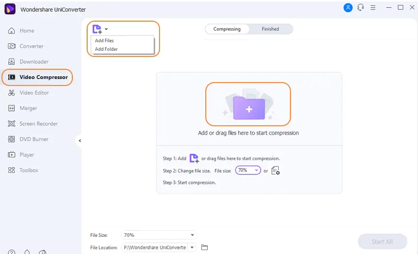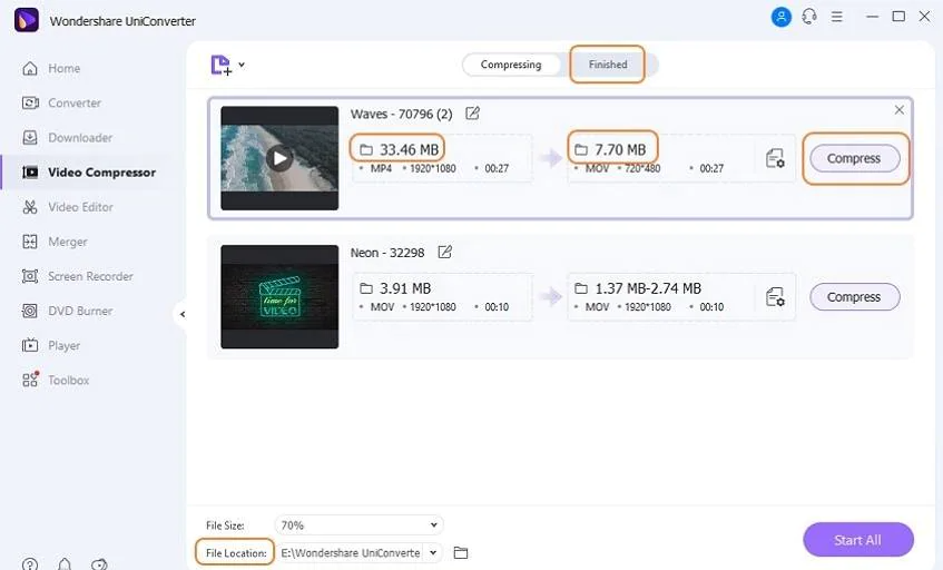 La posizione sul desktop in cui salvare il file può essere selezionata dalla scheda Posizione del file. Infine, fai clic sul pulsante Comprimere per avviare l’elaborazione del video. Sull’interfaccia del software, i video compressi possono essere localizzati nella scheda Finito.