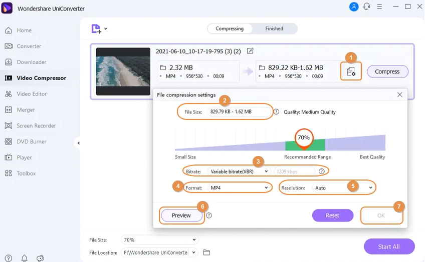 I video aggiunti verranno visualizzati con i dettagli e un’immagine in miniatura. Fai clic sull’icona delle impostazioni (punto 1 evidenziato nella figura sotto) e si aprirà una nuova finestra pop-up. Sposta il cursore accanto a Dimensione file per selezionare la dimensione e la qualità desiderate e puoi impostare Bitrate su Bitrate costante o Bitrate variabile. È anche possibile modificare il formato e la risoluzione secondo necessità. Fai clic sul pulsante OK per confermare le impostazioni.