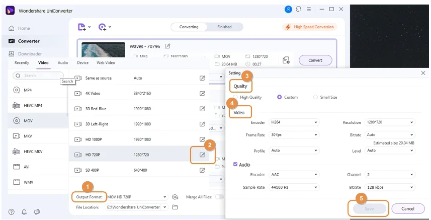 Nota: un altro modo per comprimere più file con parametri di compressione simili consiste nell’utilizzare la sezione Convertitore. Mentre selezioni il formato di destinazione durante la conversione batch, puoi modificare le impostazioni e scegliere la qualità del file (risoluzione), il frame rate e il bitrate. In questo modo è possibile salvare e selezionare un nuovo formato personalizzato per tutti i file aggiunti.