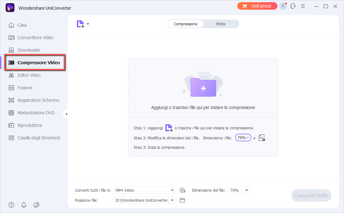Avvia il software UniConverter sul tuo PC e scegli la funzione Compressore video dal pannello di sinistra dell’interfaccia principale.